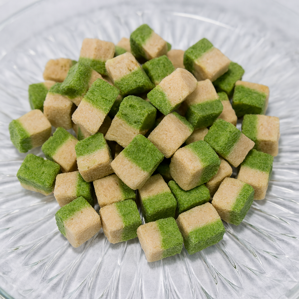 "Freeze-dried chicken, cat grass, and egg yolk cubes — a nutritious blend designed for pets. Chicken provides high-quality protein, cat grass aids digestion and supports urinary tract health, and egg yolk offers essential vitamins for skin and coat care. 100% natural, with no artificial additives or preservatives."